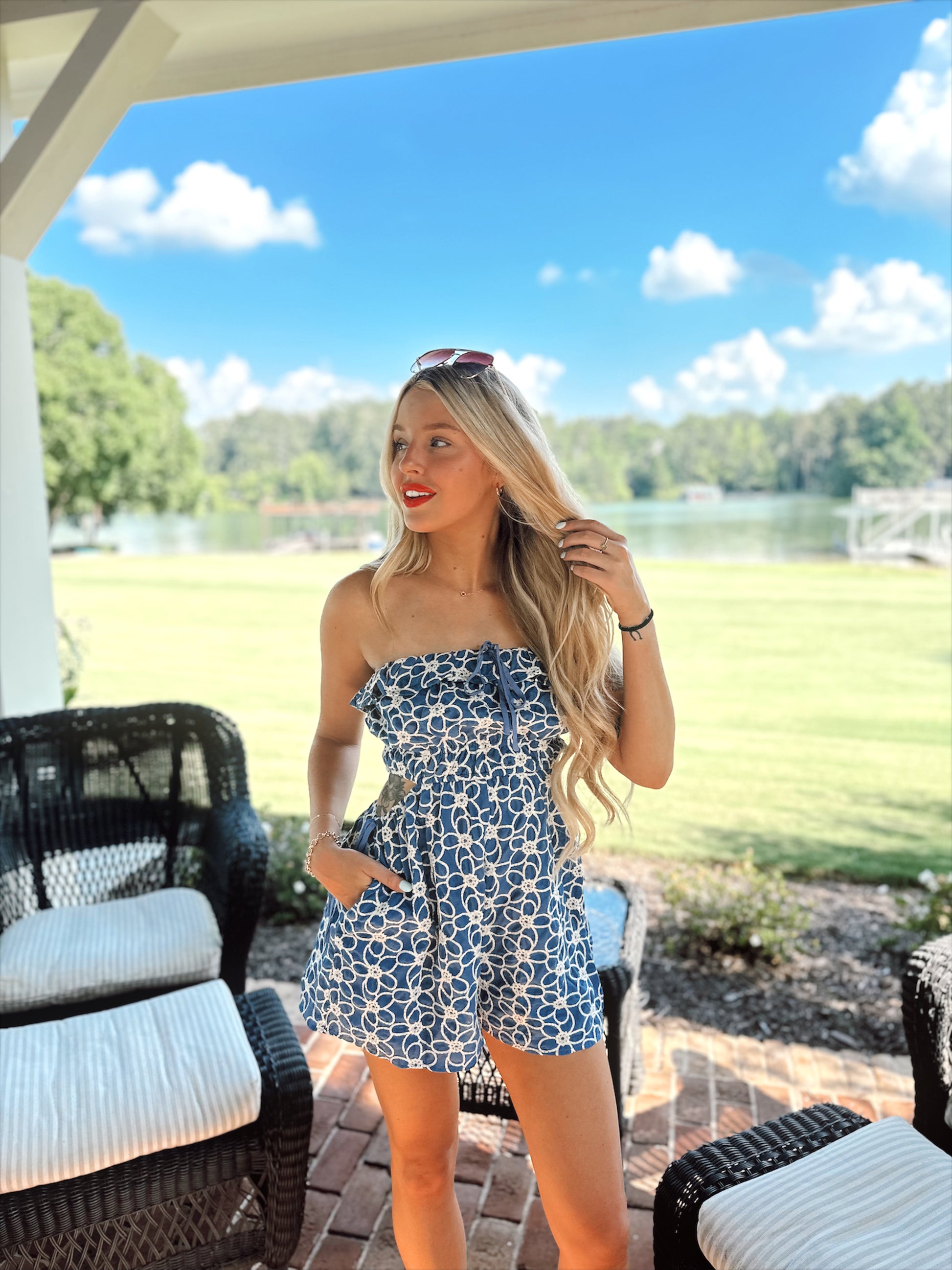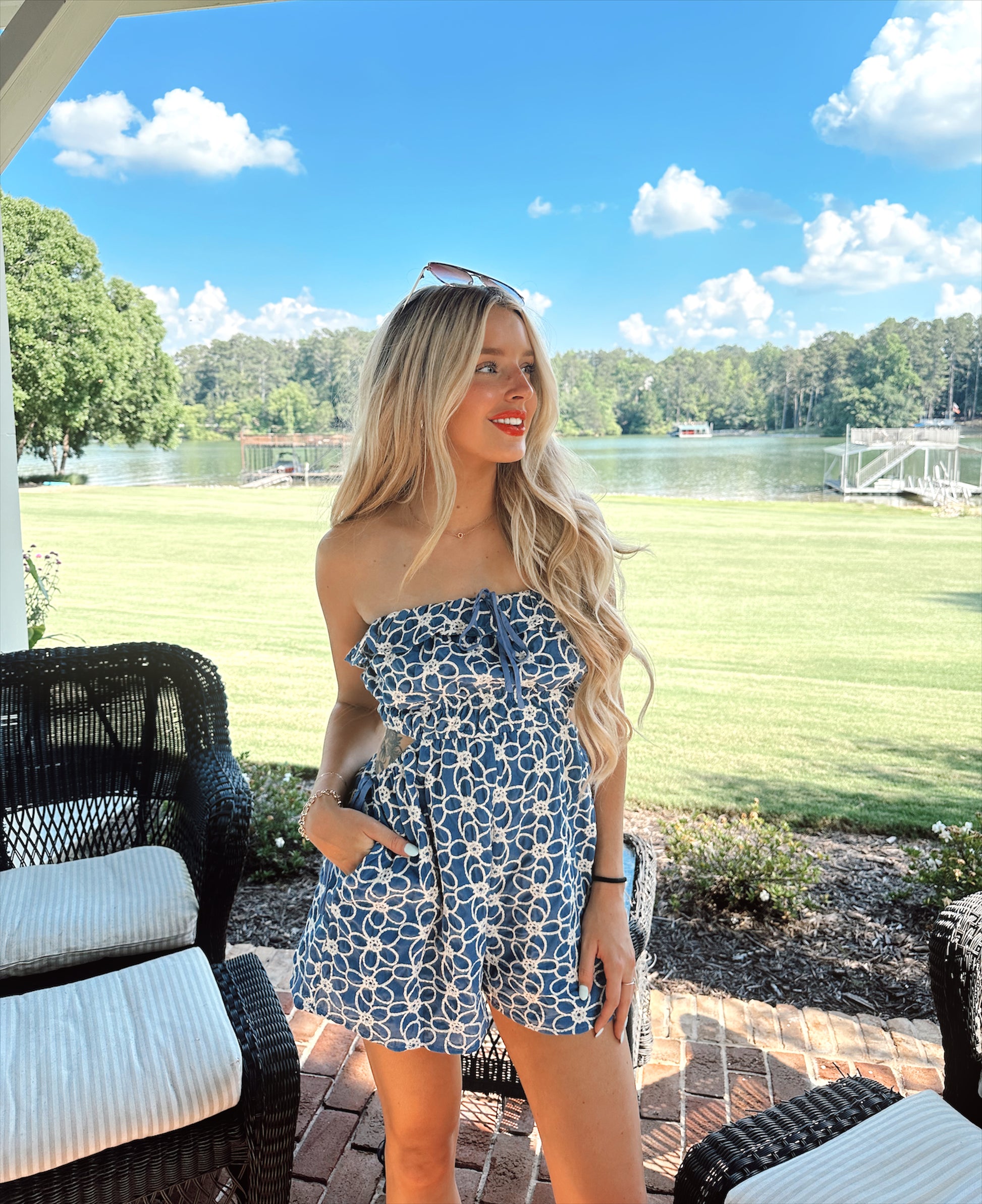 Floral detailing, open sides/back. Cute ribbon detailing in the front. Perfect for summer dates nights!