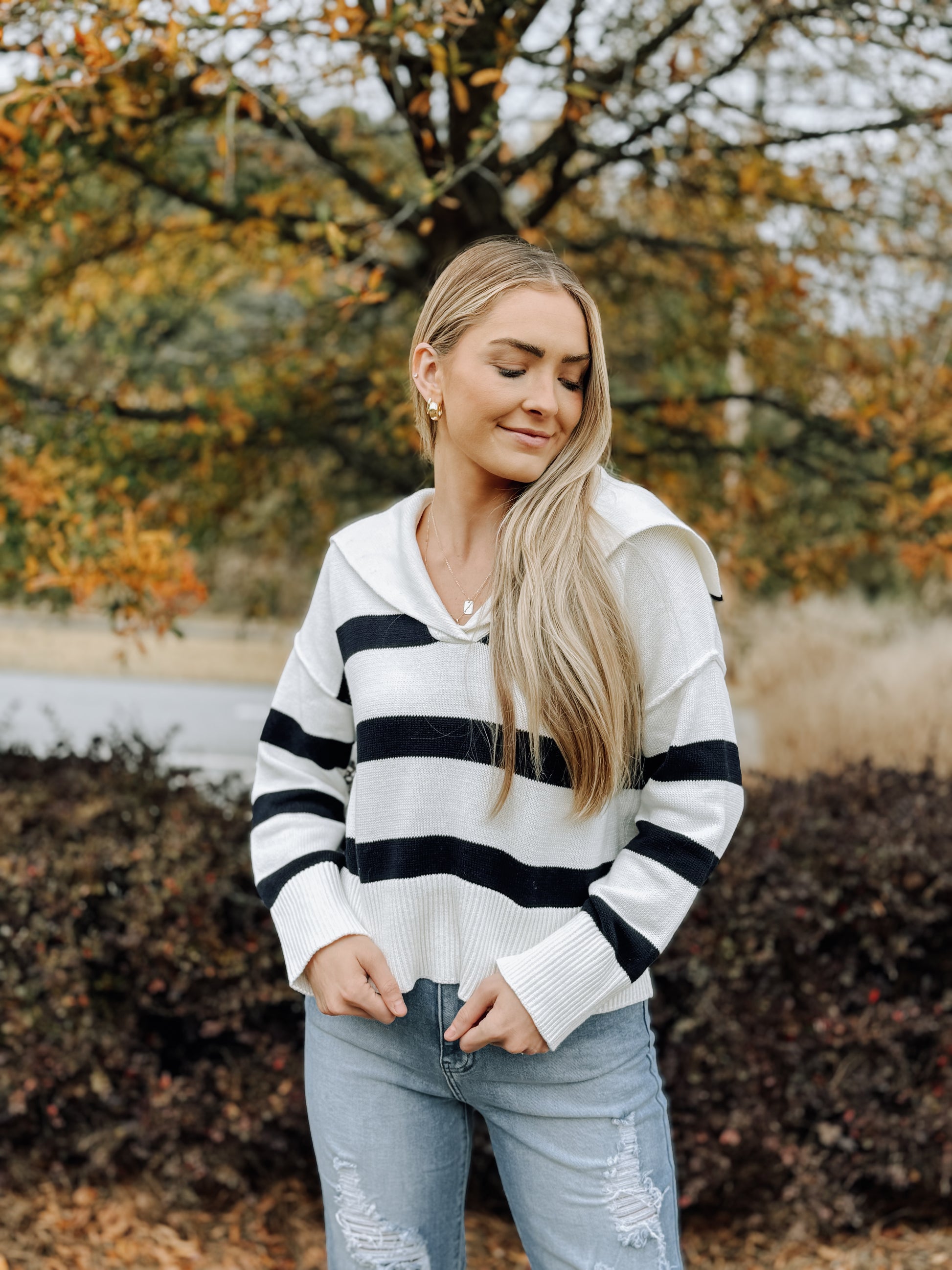 Our Demi Striped Sweater- Check out our Navy and White Striped Sweater. It's got a cool, relaxed V-neck collar and a classic stripe pattern. Comfy and stylish, it's an easy pick for any outfit, any day.