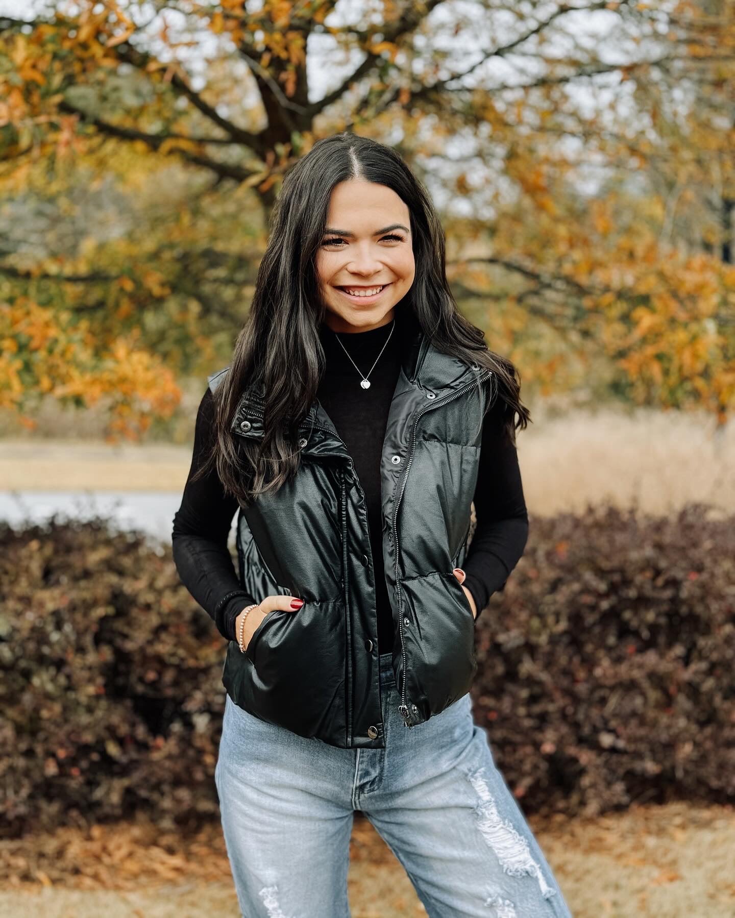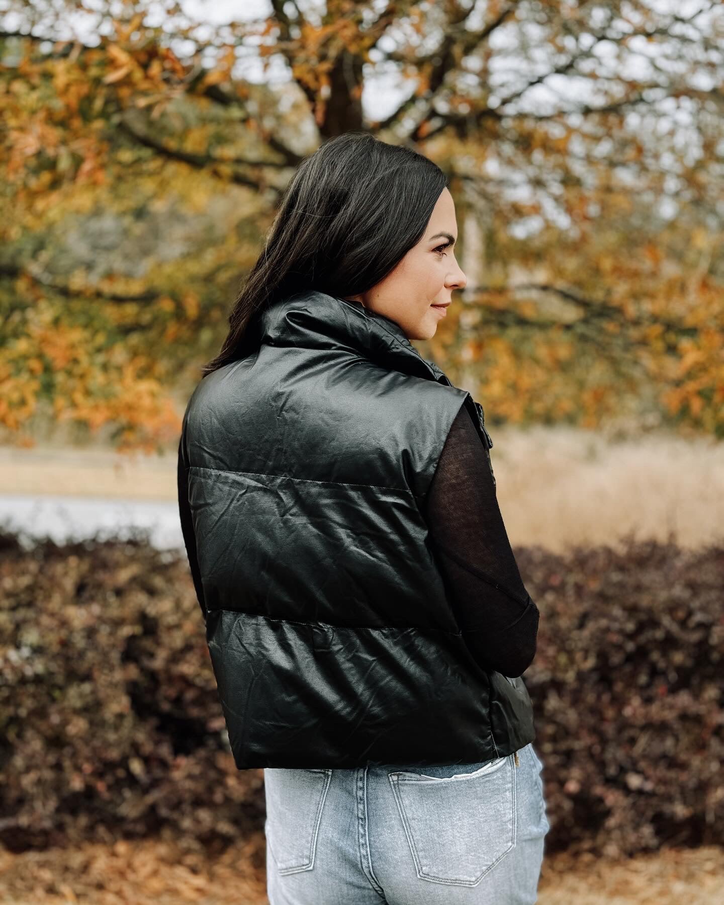 Elevate your layering game with our Luna Puffer Vest in sleek faux leather. Perfect for transitional weather, this vest combines chic style with practical warmth. Its streamlined design and luxe texture make it a versatile staple for any fashion-forward wardrobe.