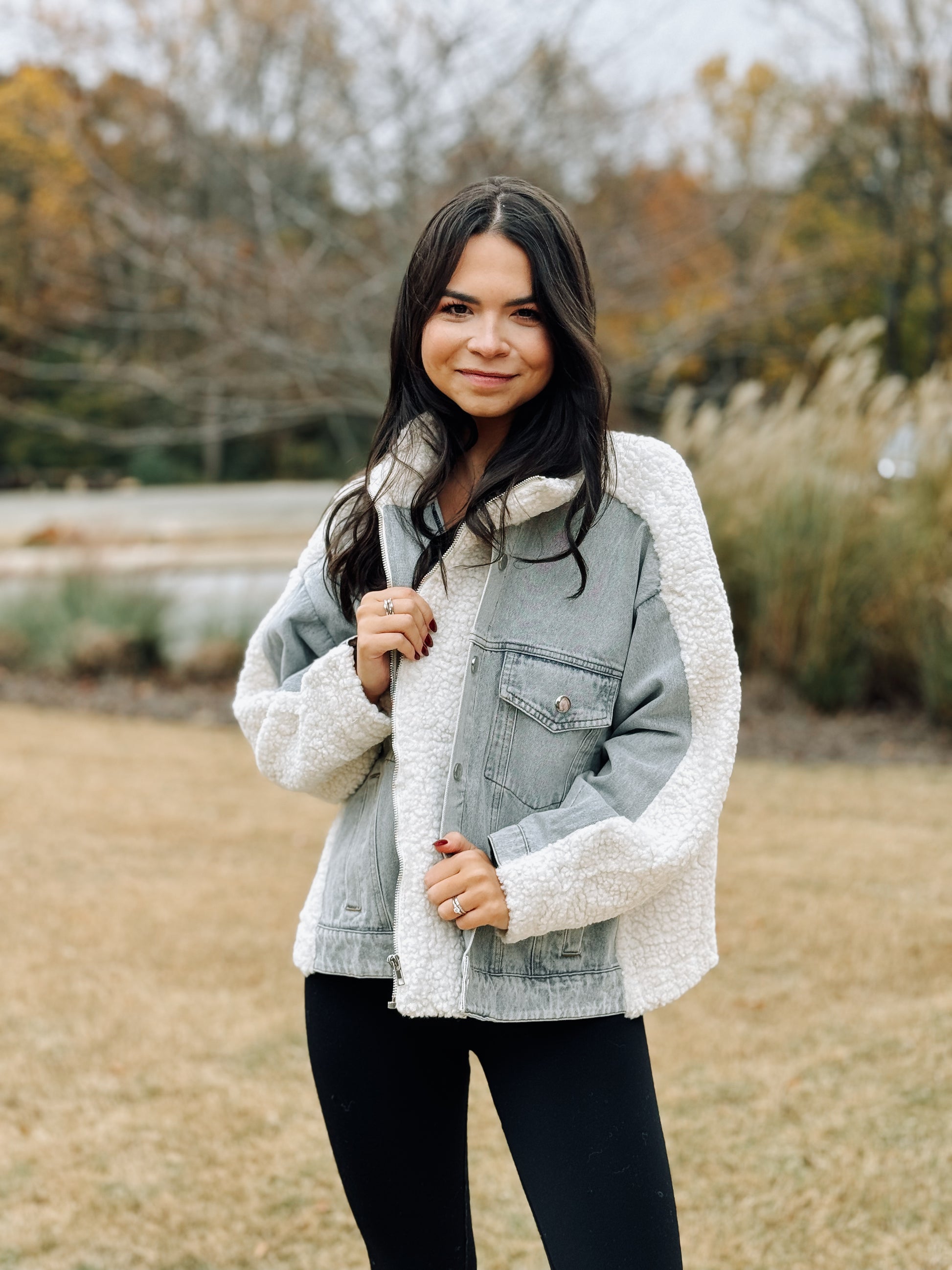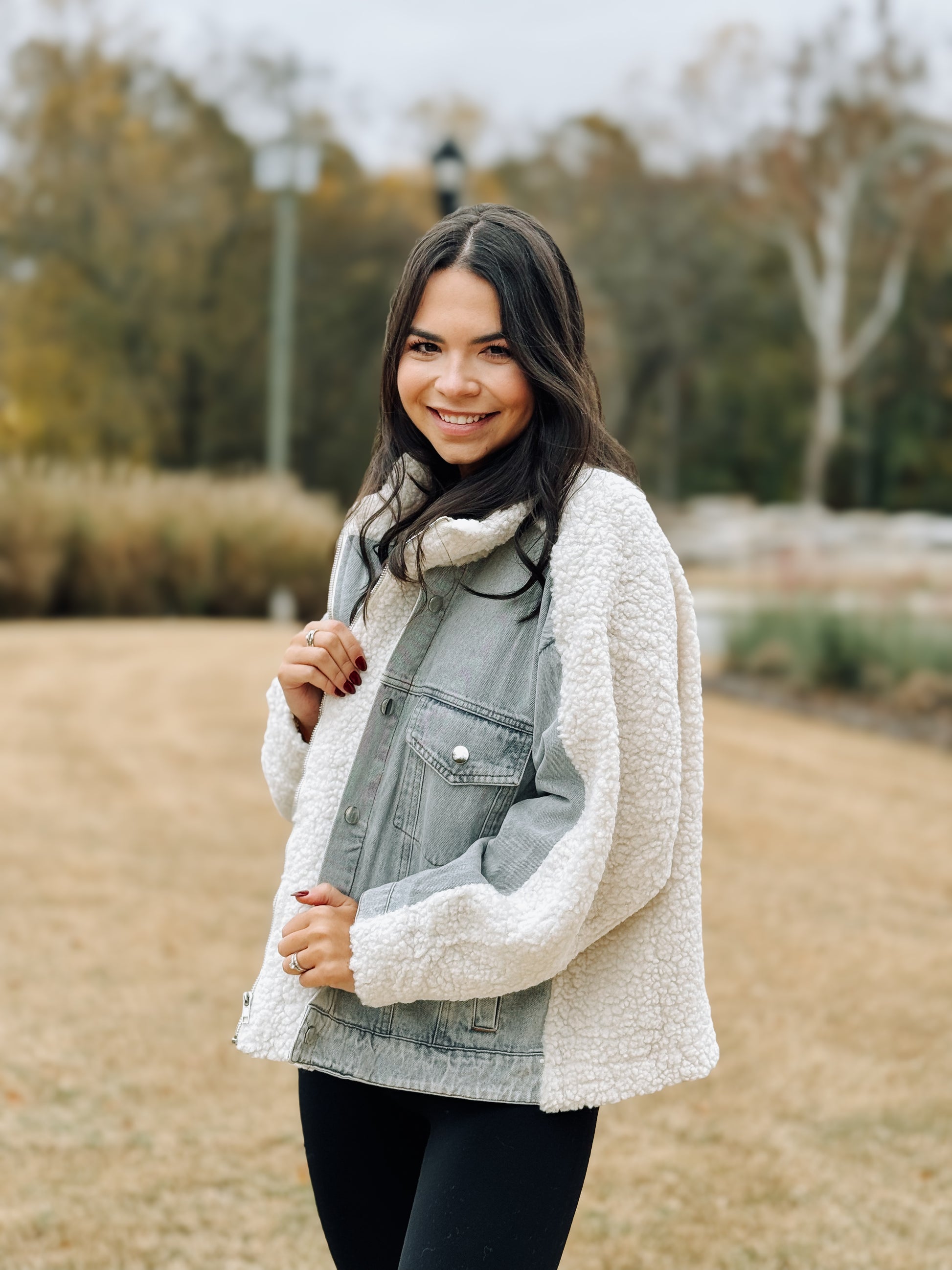 Oversized Denim/Sherpa Jacket- Cream. Dive into comfort with our Oversized Denim Sherpa Jacket. Made from quality denim and snug sherpa inside, it's cool yet cozy. Its relaxed fit is perfect for layering and adds a chic touch to cold days. A modern essential for every wardrobe.
