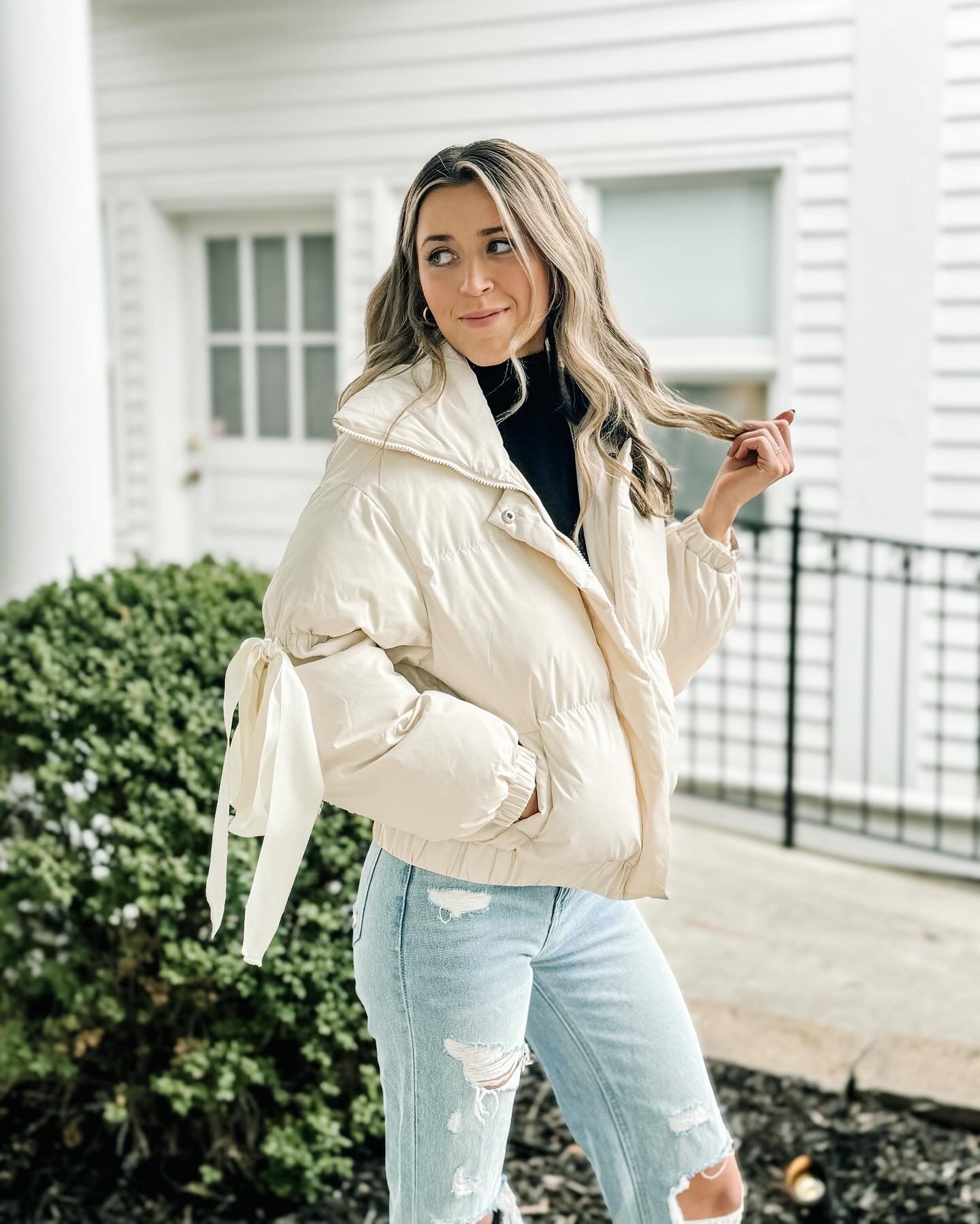 Embrace the winter charm in our Cream Ribbon Puffer Jacket. This elegant piece features unique ribbon detailing, blending warmth with high fashion. Perfect for all those chilly winter days. Also, would be so cute for any of you winter brides!