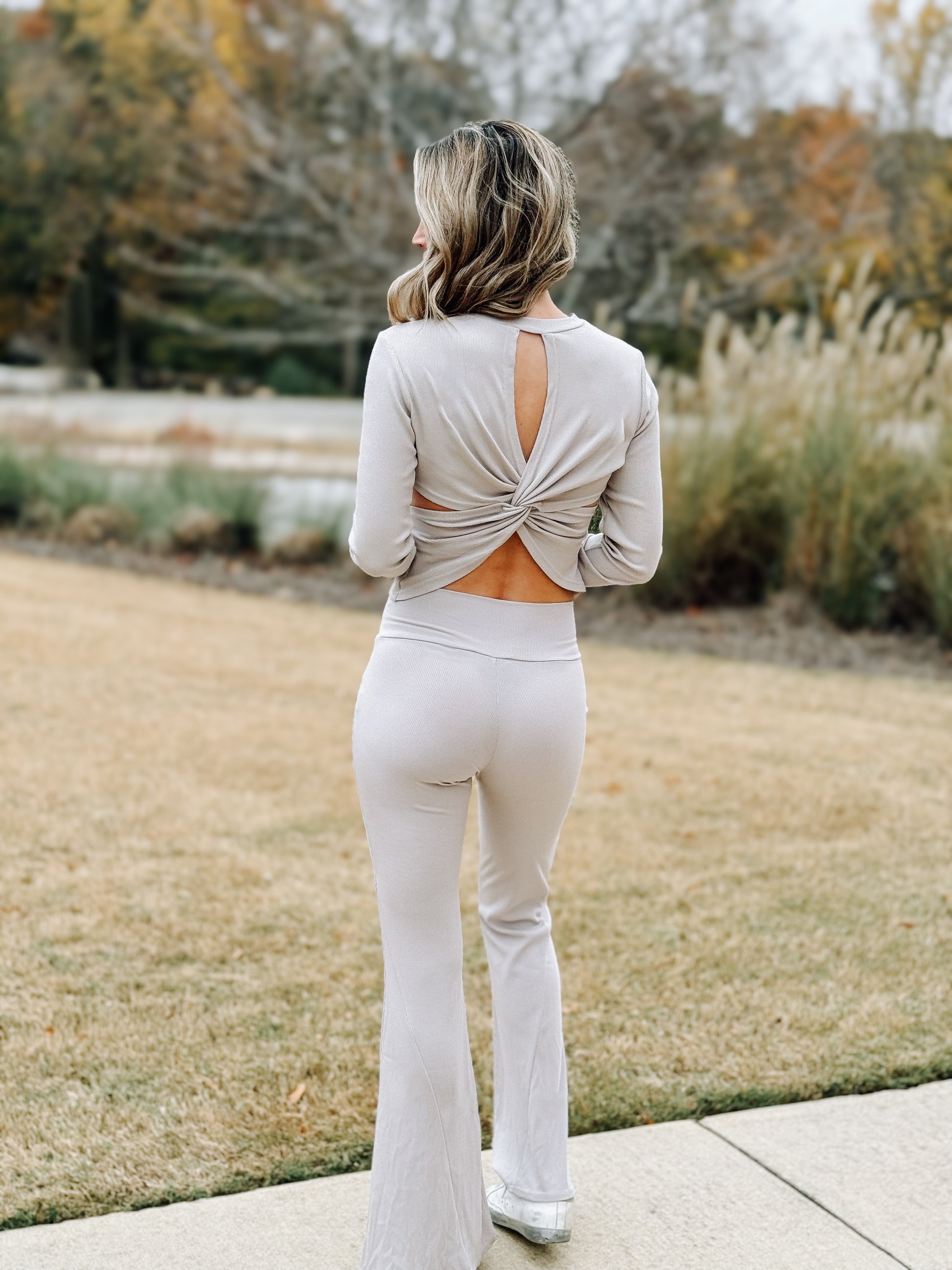 Step into effortless style with our Taupe Two-Piece Set, featuring a fun and unique back design. This set pairs comfort with a hint of allure. A must-have set!